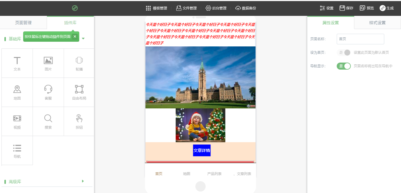 1.在编辑器中,将需要的插件拖入到编辑器中,点击保存,然后点击生成,选择“支付宝”,并点击下载即可,其他操作方式与“支付宝小程序标准版”一致,这里不做赘述,如图所示: